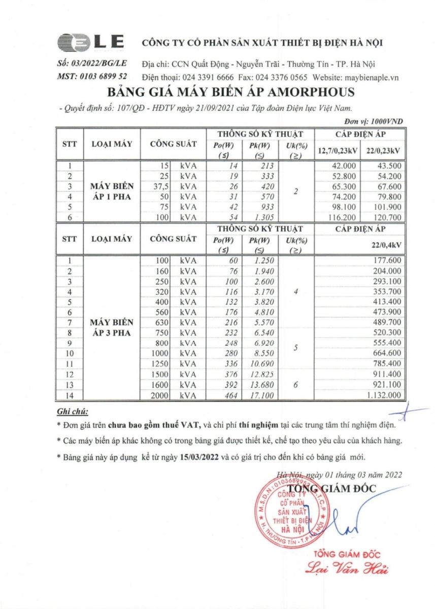 Với các loại máy biến áp LE có công suất ngoài bảng giá, quý khách vui lòng liên hệ hotline 0964.929.256 để được tư vấn và báo giá.