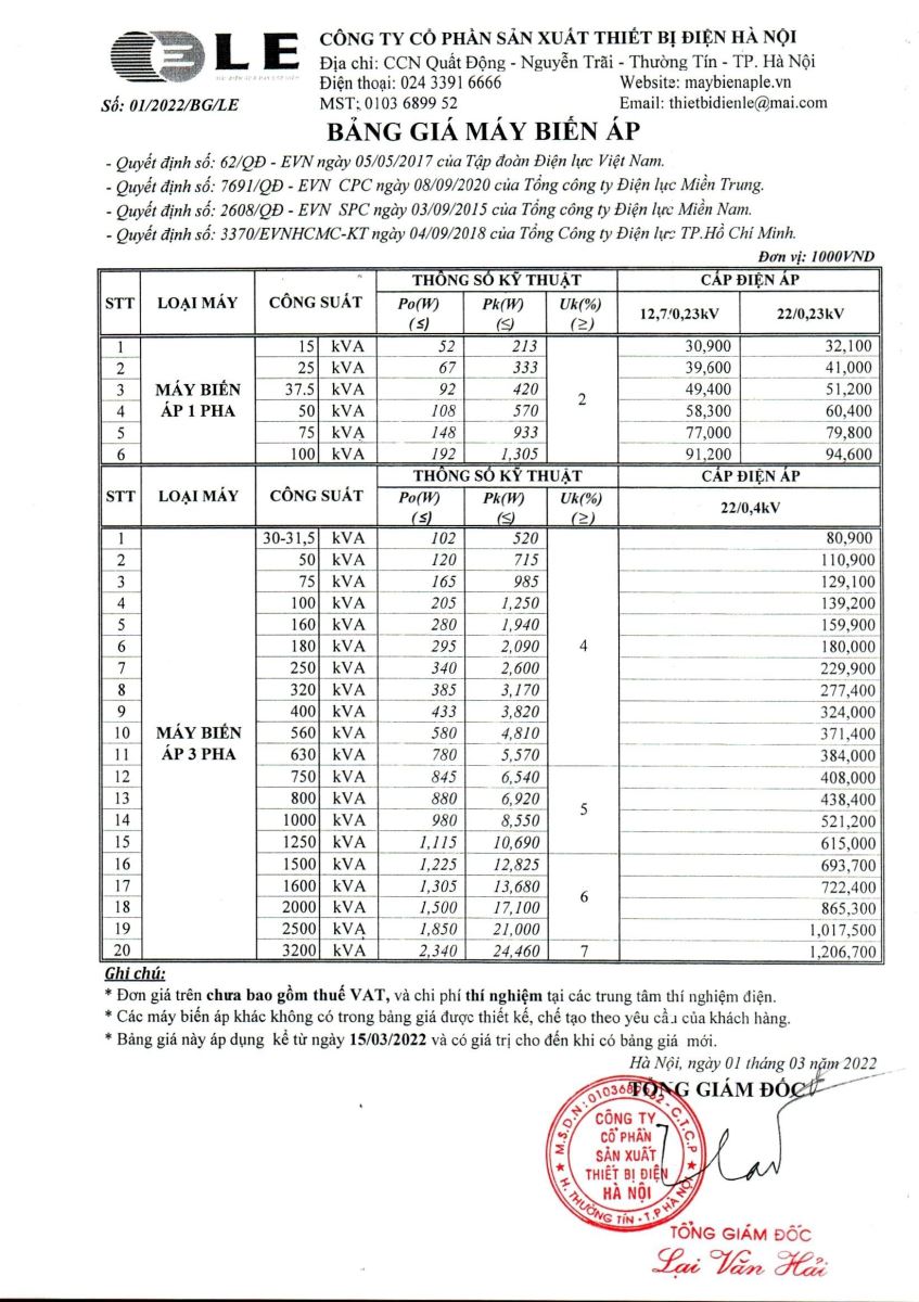 Bảng giá máy biến áp LE mới nhất năm 2022 theo quyết định số 62/QĐ-EVN ngày 05/05/2017 của Tập đoàn Điện lực Việt Nam.